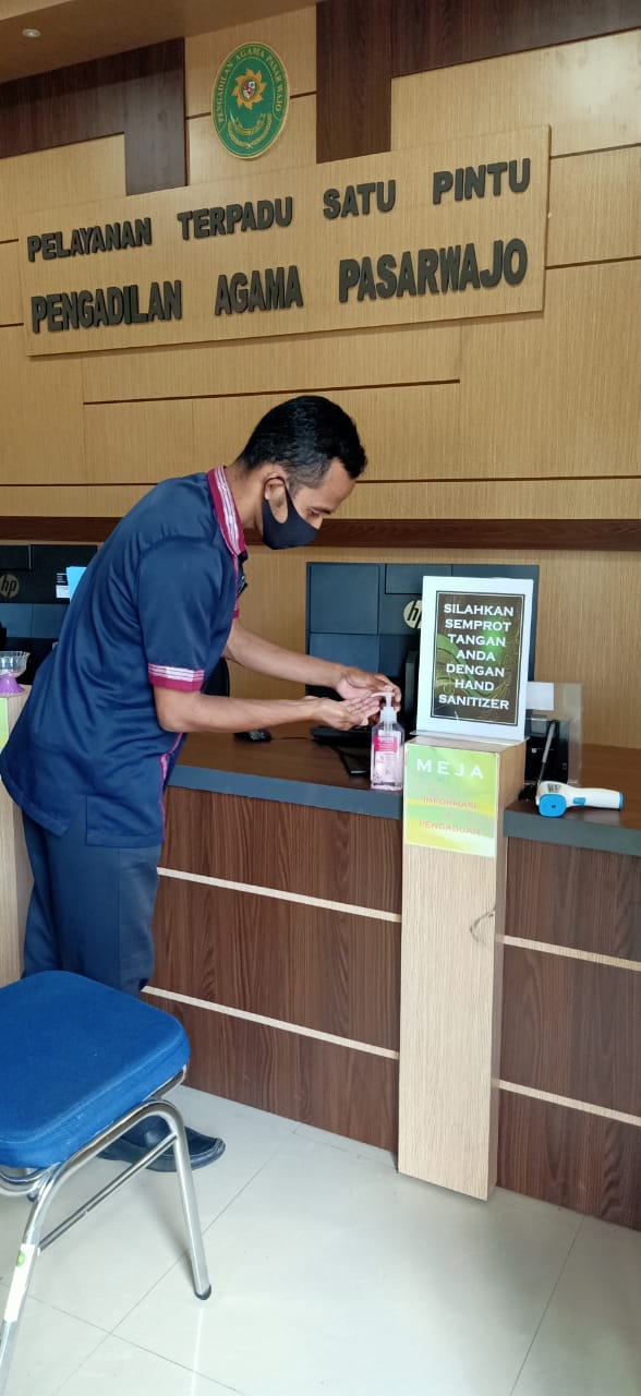 Dalam kondisi pandemi Covid-19 ini, masyarakat merasa takut untuk keluar rumah, terlebih lagi para aparatur Pengadilan Agama Pasarwajo Yang bersentuhan secara langsung dengan Masyarakat,sehingga Pengadilan Agama Pasarwajo memberikan himbauan kepada pihak atau pengunjung yang ingin masuk di ruang PTSP untuk mengikuti protokol kesehatan, maka para pencari keadilan diwajibkan untuk ;